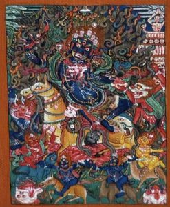 吉祥天母又称吉祥天女,梵文Laksmī,音译拉娔诗米,藏语称班达拉姆,是藏密中一个重要女性护法神。她是古印度神话中的人物,传说是天神和仇敌阿修罗搅动乳海时诞生的。后来婆罗门教和印度教把她塑造成女神,为她取名功德天女(又称吉祥天女),她是毗湿奴的妃子,财神毗沙门之妹,主司命运和财富。后来她成了佛教的重要护法神。