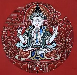 四臂观音本尊身颜洁白如月,头戴五佛冠,发黑色结髻,中央二手合掌於胸前,捧有摩尼宝珠,右手持水晶念珠。左手拈八瓣莲花与耳际齐,面貌寂静含笑。以菩萨慧眼凝视众生,凡被其观者尽得解脱。全身花蔓庄严,双跏趺坐於莲花月轮上,身发极大五彩光,明朗照耀。