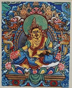 黄瞻巴拉即黄财神:《瞻巴拉修炼方便》中载:宝贝座上雄狮立,莲花宝贝放光芒,方便犹如日月辉,此为财神阿尔亚瞻巴拉。该神身黄挺肚,以绸缎宝贝作装饰;头戴宝冠,花卉耳饰和项链;臂戴臂镯,足饰足镯;上身着衣下身裙,以财运之神而傲立,三目愤怒注视左前方;右手持宝珠置于胸前,左手持吐宝兽置于膝上;两足伸缩有致甚庄严。