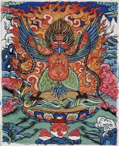 大鹏鸟即是佛教所谓的金翅鸟,是一种有五种神通(神足通,他心通,宿命通,天耳通,天眼通)的飞禽。大鹏金翅鸟出生就具备飞翔的力量,伸展天生坚硬似铁的喙爪,翘着金刚钻石般的角,顶上有奕奕放光的宝珠,火眼如同日月般闪烁,钢铁一般坚固的嘴如铁钩,宛如宝剑般的翅膀在空中舞动,金色利刃的翎羽缝隙中降下热沙雨,居住在大铁树上。以龙为食。这里指的龙也是有五种神通:神足通,他心通,宿命通,天耳通,天眼通。它们此类众生异常凶狠残暴,因此当它死亡时,身上燃起熊熊烈火,不仅将自身所有的血肉骨焚为灰迹,而且能够焚烧周围的一切林园。据说大鹏鸟的心脏是一颗宝珠,死后坠入海底。它每天要吃一个龙王及五百条小龙,因此,它体内积蓄了极重的毒气,到命终时,龙毒发作,上下翻飞七次,飞到金刚山顶上自焚而亡。