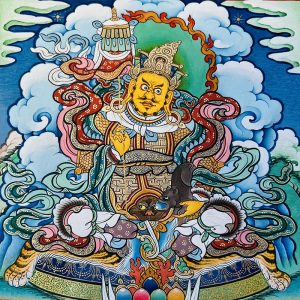 北方多闻天王(梵文:Vaiśravaṇa;藏名:Rnam-thos-kyi-bu / Jambhala):又名毗沙门,“多闻”意为颇精通佛法,以福、德闻于四方。住须弥山黄金埵,身为绿色,穿甲胄,左手卧银鼠,右持宝伞(或作宝幡),有两义: