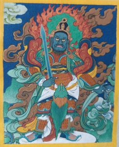 东方持国天王(梵文:Dhṛtarāṣṭra;藏名:Yul-hkhor-bsrun):“持国”意为慈悲为怀,保护众生,护持国土,故名持国天王。住须弥山白银埵,身为白色,穿甲胄,手持琵琶或阮琴,有两义: