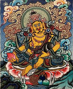 为令密乘行者有资财宏法利生,不被生活所逼,可安心向道,特赐予行者财利丰足。黄财神一面二臂,五佛冠为头饰,矮小肚大,双臂劲力,右手持布拉噶如意宝,左手提着吐宝鼠,身着天衣,蓝莲花及珠宝璎珞作装饰,胸前挂念珠。左足屈,右足踩着海螺宝,以如意姿安座于莲花月轮之上。 黄财神是藏传佛教各大教派普遍供养的五姓财神之一,因其身相黄色,故称黄财神。修持黄财神法、持诵其密咒,可获得黄财神庇佑,能增长福德、寿命、智能、物质及精上之受用,不被生活所逼,以及一切经济压迫,可安心向道。但修法者需发无上菩提心,广结善缘,勤行布施。万勿悭贪成性,护法降罪也. 黄财神即黄布禄金刚,黄财神面慈目善,头戴宝冠,坦胸露腹,戴着珍宝璎珞、珍宝耳环、珍宝手镯和珍宝足钏,上身穿丝制天衣,下身着丝制裙子,右手于右膝上捧喷焰末尼,左手握着吐宝鼬,以威镇坐姿坐在莲花宝座中央。身后有光环、祥云、远山。能增长福德、寿命、智慧、物质及精神上之受用。主司财富,能使一切众生脱于贫困,财源广进。