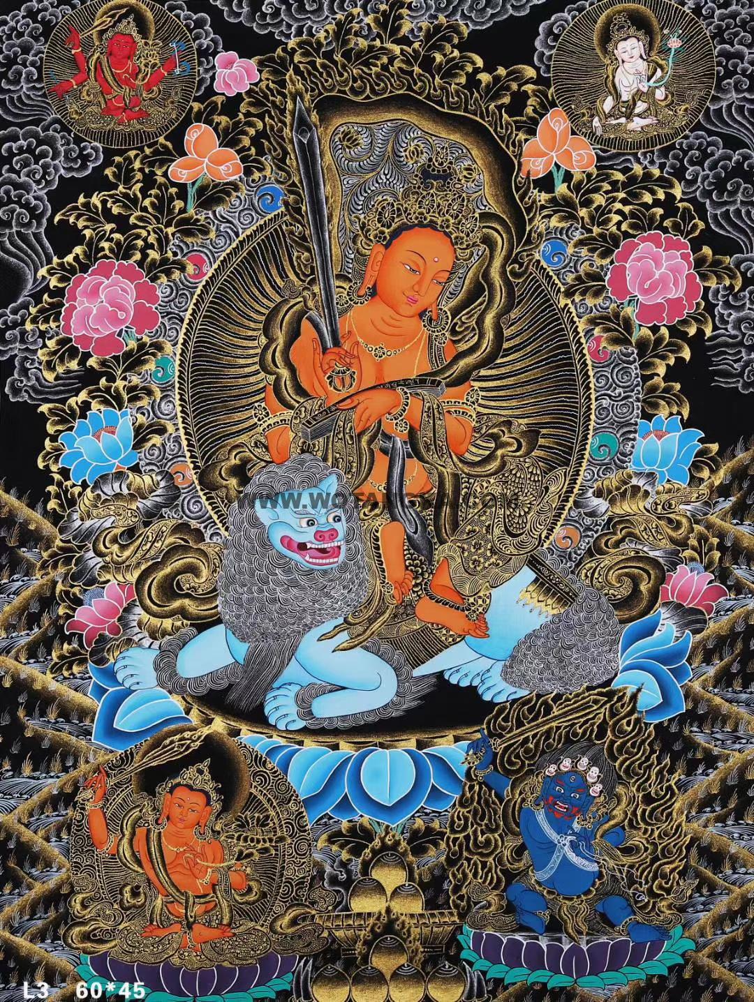 尼泊尔知名唐卡大师作品《文殊菩萨》,作品采用24K真金磨粉描线,混合天然颜料纯手绘而成。作品主尊宝相传神,布图干净精美、画工非常的细腻,严格的遵照佛经的度量仪轨如法绘制,期待有缘人。