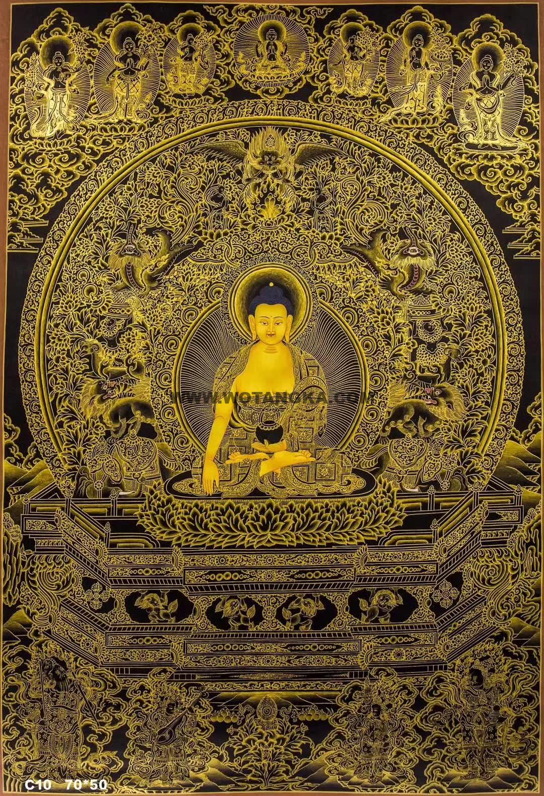 尼泊尔知名唐卡大师作品《释迦牟尼佛》,作品采用黑底色打底,24K真金磨粉描线,混合天然颜料纯手绘而成。作品主尊宝相传神,布图干净精美、画工非常的细腻,严格的遵照佛经的度量仪轨如法绘制,期待有缘人。