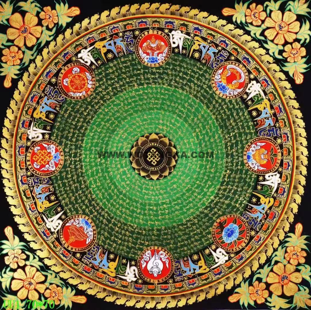 坛城象征宇宙本源,是圣坛的代表,挂与家里玄关之处,有镇宅辟邪的妖邪不入的作用,古代著名寺院皇宫都用此法门来镇宅辟邪,十分殊胜。喜欢不要错过。六字大明咒是观世音菩萨心咒,源于梵文中,此咒含有诸佛无尽的加持与慈悲,是诸佛慈悲和智慧的音声显现。能改变命运,修成幸福健康的人生。