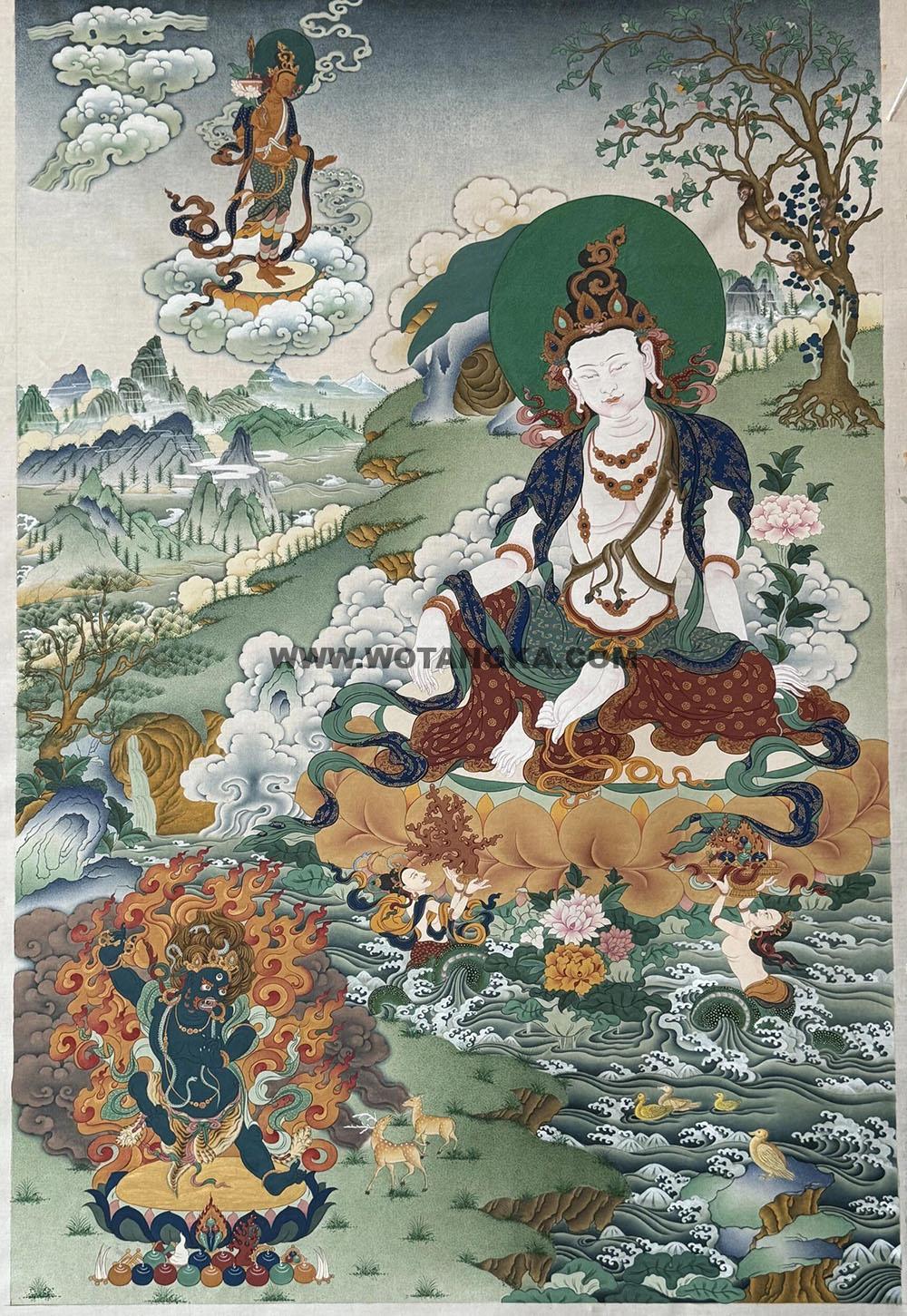 唐卡作品名称:观音菩萨雪域三怙主二龙女献宝如意吉祥供养图