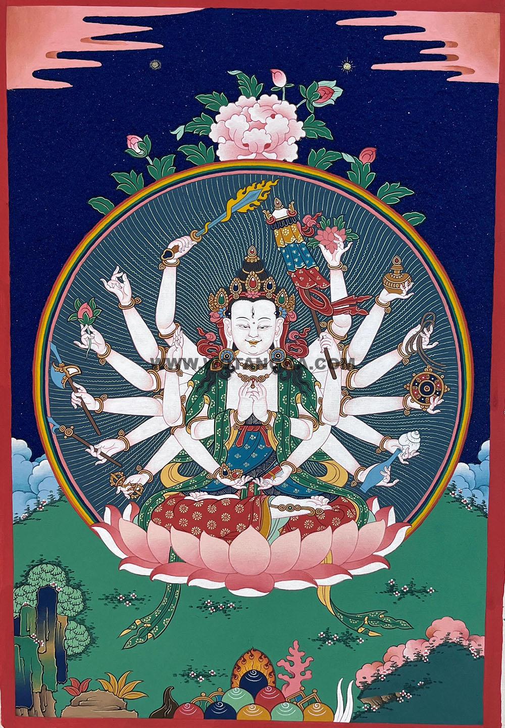 中国唐卡艺术作品中的【准提佛母】唐卡手绘布本,西藏知名画师米玛扎西·画院出品,收藏供奉不要错过。作品主尊宝相传神, 采用天然矿石晕染,纯金描线,画工细腻,殊胜,精美、风格富丽,采用24K真金描绘,画工细腻,开脸殊胜,是一副难得一见的好唐卡作品。