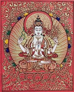 四臂观音本尊身颜洁白如月,头戴五佛冠,发黑色结髻,中央二手合掌於胸前,捧有摩尼宝珠,右手持水晶念珠。左手拈八瓣莲花与耳际齐,面貌寂静含笑。以菩萨慧眼凝视众生,凡被其观者尽得解脱。全身花蔓庄严,双跏趺坐於莲花月轮上,身发极大五彩光,明朗照耀。