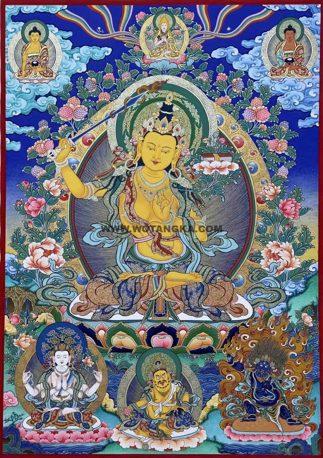 中国唐卡艺术作品中的【文殊菩萨·三怙主】唐卡手绘布本,热贡知名画师卓玛·画院出品,收藏供奉不要错过。作品主尊宝相传神, 采用天然矿石晕染,纯金描线,画工细腻,殊胜,精美、风格富丽,采用24K真金描绘,画工细腻,开脸殊胜,是一副难得一见的好唐卡作品。
