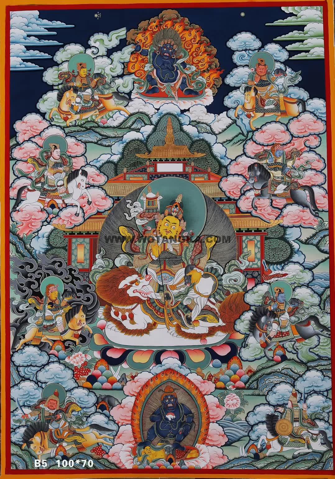 安多强巴精品唐卡【八马财神】源于古格王朝寺院壁画,齐岗画派。纯正矿物质染料,纯金拉线。古法手工画布,纯矿物颜料,真金描绘简介:该幅作品以天然矿石颜料,植物颜料为底,真金描绘,矿物颜料晕染,画面细腻丰富,主尊开脸慈悲传神,无上殊胜。