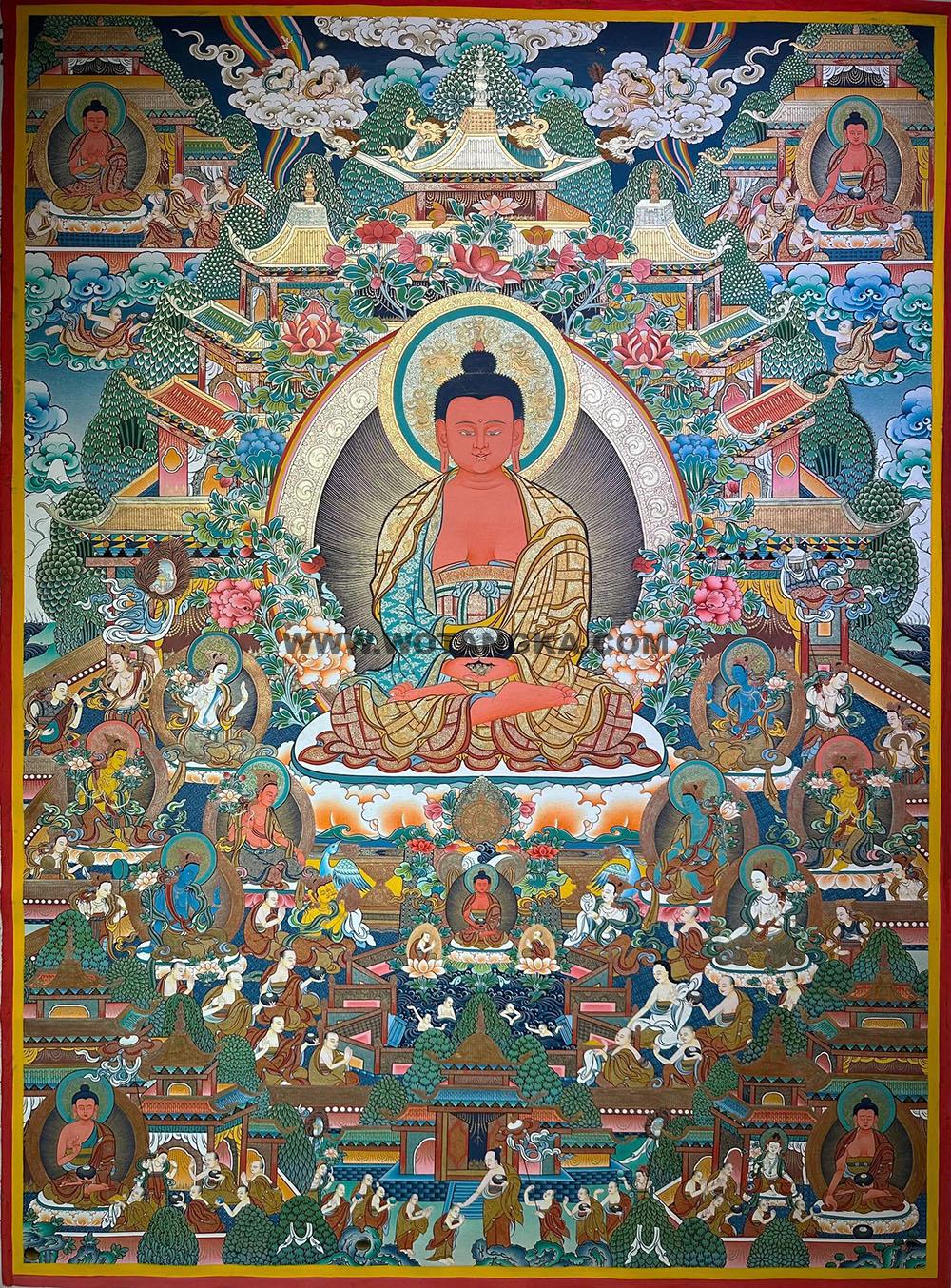 中国唐卡艺术作品中的【阿弥陀佛·极乐净土】唐卡手绘布本,热贡知名画师尼玛次仁·画院出品,收藏供奉不要错过。作品主尊宝相传神, 采用天然矿石晕染,纯金描线,画工细腻,殊胜,精美、风格富丽,采用24K真金描绘,画工细腻,开脸殊胜,是一副难得一见的好唐卡作品。