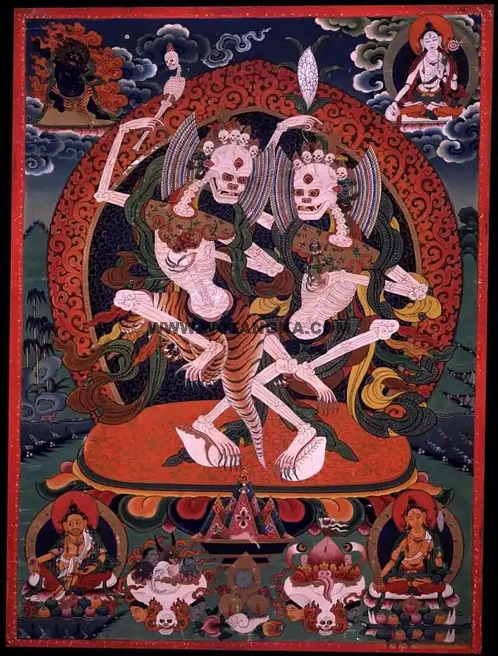 尸林怙主夫妇的形象极为阴森恐怖,是两具没有血肉的完整人体骨架,全身白色,一面二臂,右手高举人头骨棒,左手承托盛满鲜血的颅器,分别踏立在莲花日月轮垫上的海螺和贝壳上面,作舞姿状.