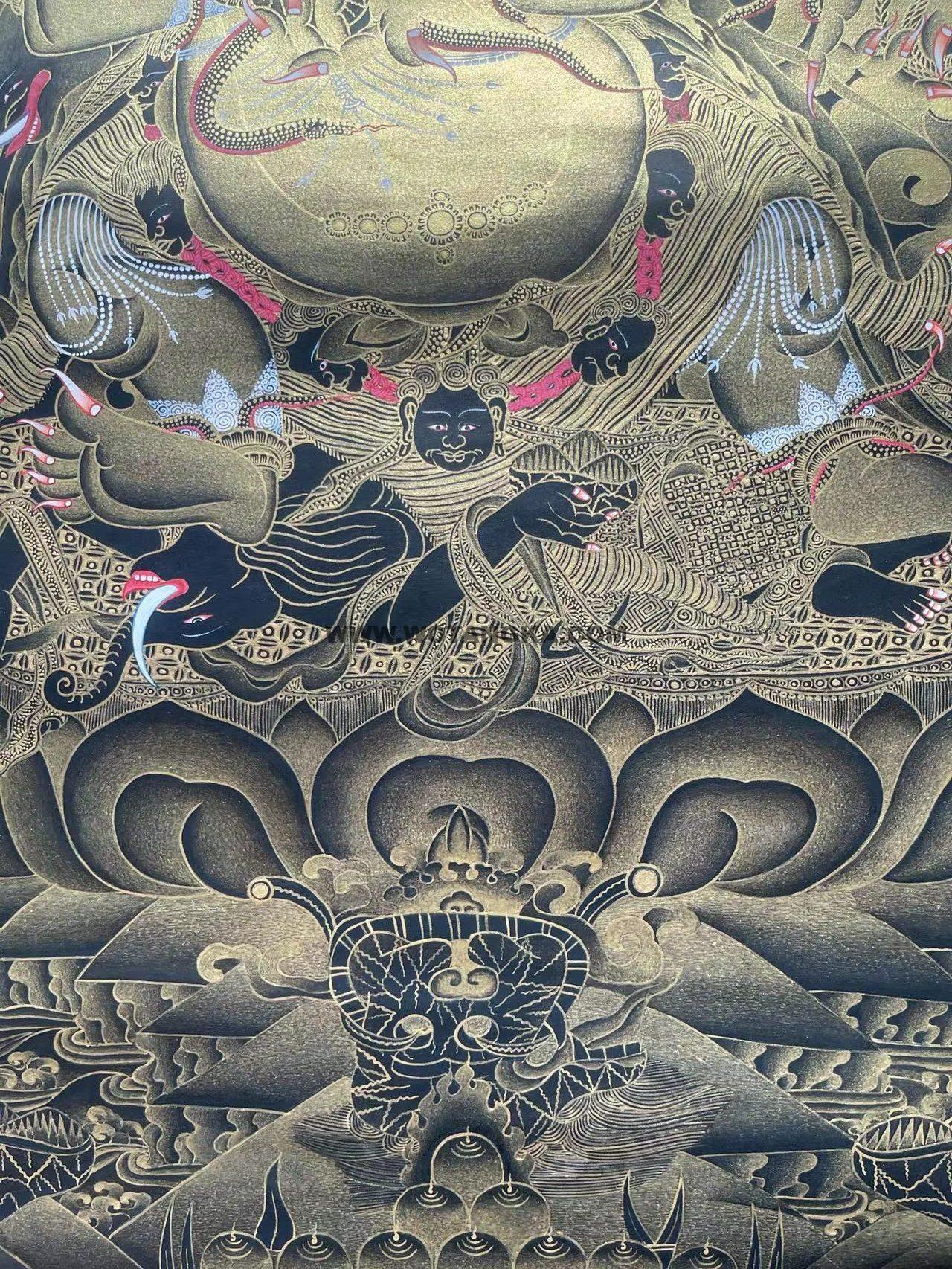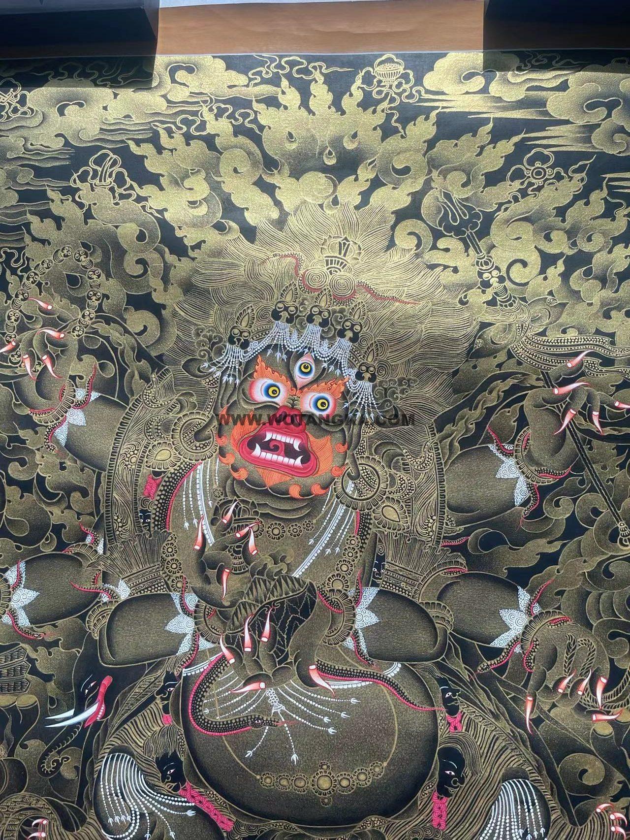 尼泊尔知名画师绘制《白六臂玛哈嘎拉》唐卡手绘布本,采用真金描线,黑底色打底,天然矿石颜料着色晕染,画工细腻,开脸殊胜,是一副难得一见的好唐卡作品。