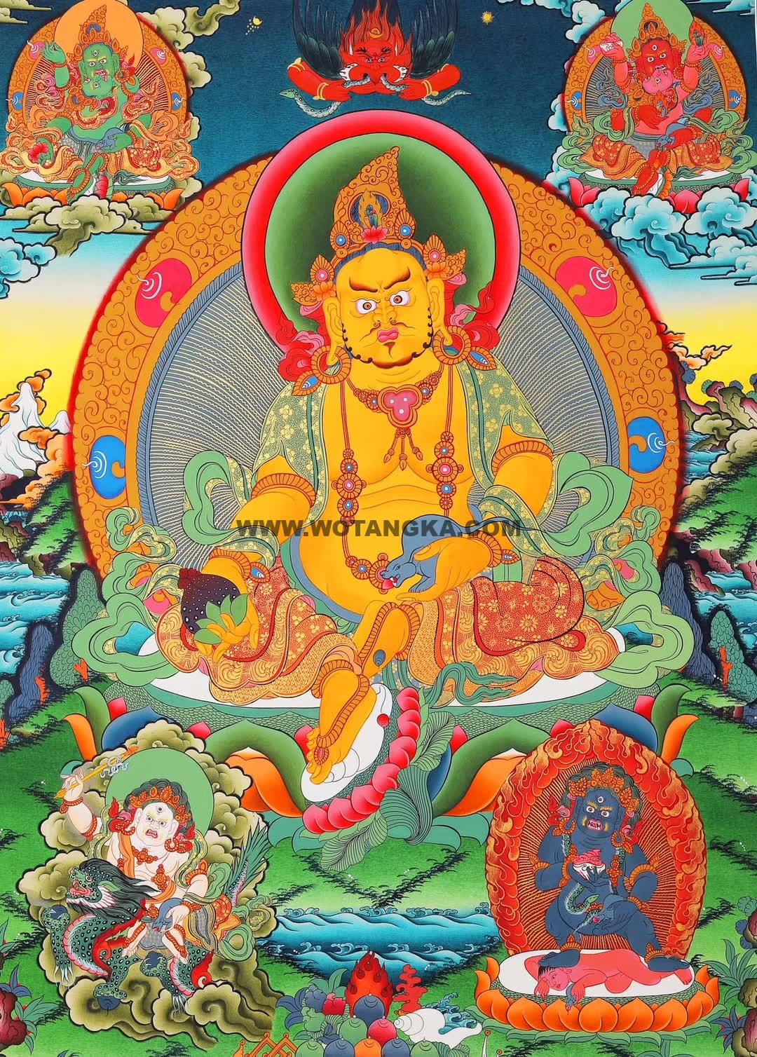 尼泊尔知名喇嘛力作唐卡【五方财神】主尊宝相传神,作品采用24K真金描线,天然矿石颜料着色晕染,画工细腻,开脸殊胜,是一副难得一见的好唐卡作品。