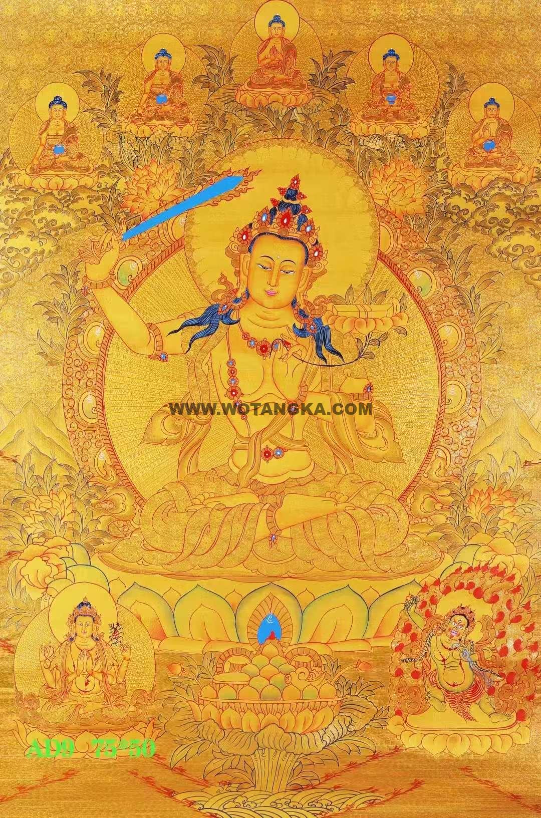 文殊菩萨是大智慧的化身,左手执金刚经、表示般若一尘不染,如大火聚,四面不可触,触之即烧。右手执宝剑,表示大智,能断一切无明烦恼,喻金刚宝剑,能斩群魔。乘莲花表示清净,能开发智慧、提高悟性、尤其能帮助小孩学业有成、官人福禄双增、商人增财增福。