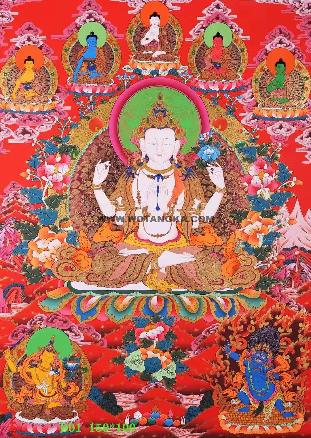 四臂观音是雪域西藏的守护神,藏人由老至幼家家户户,皆吟诵其六字大明咒:“嗡嘛呢叭咪吽”。四臂观音与文殊菩萨、金刚手菩萨,合称三族姓尊,代表大悲、大智、大力,为密乘行者人人必修的法门。