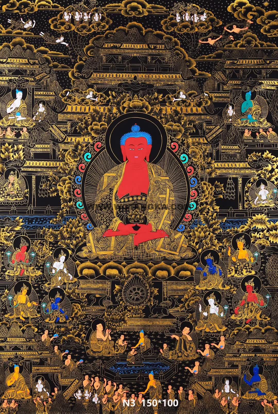尼泊尔成名喇嘛作品《阿弥陀佛》,作品采用24K真金描线,混合天然颜料纯手绘而成。作品主尊宝相传神,布图干净精美、画工非常的细腻,严格的遵照佛经的度量仪轨如法绘制,期待有缘人。