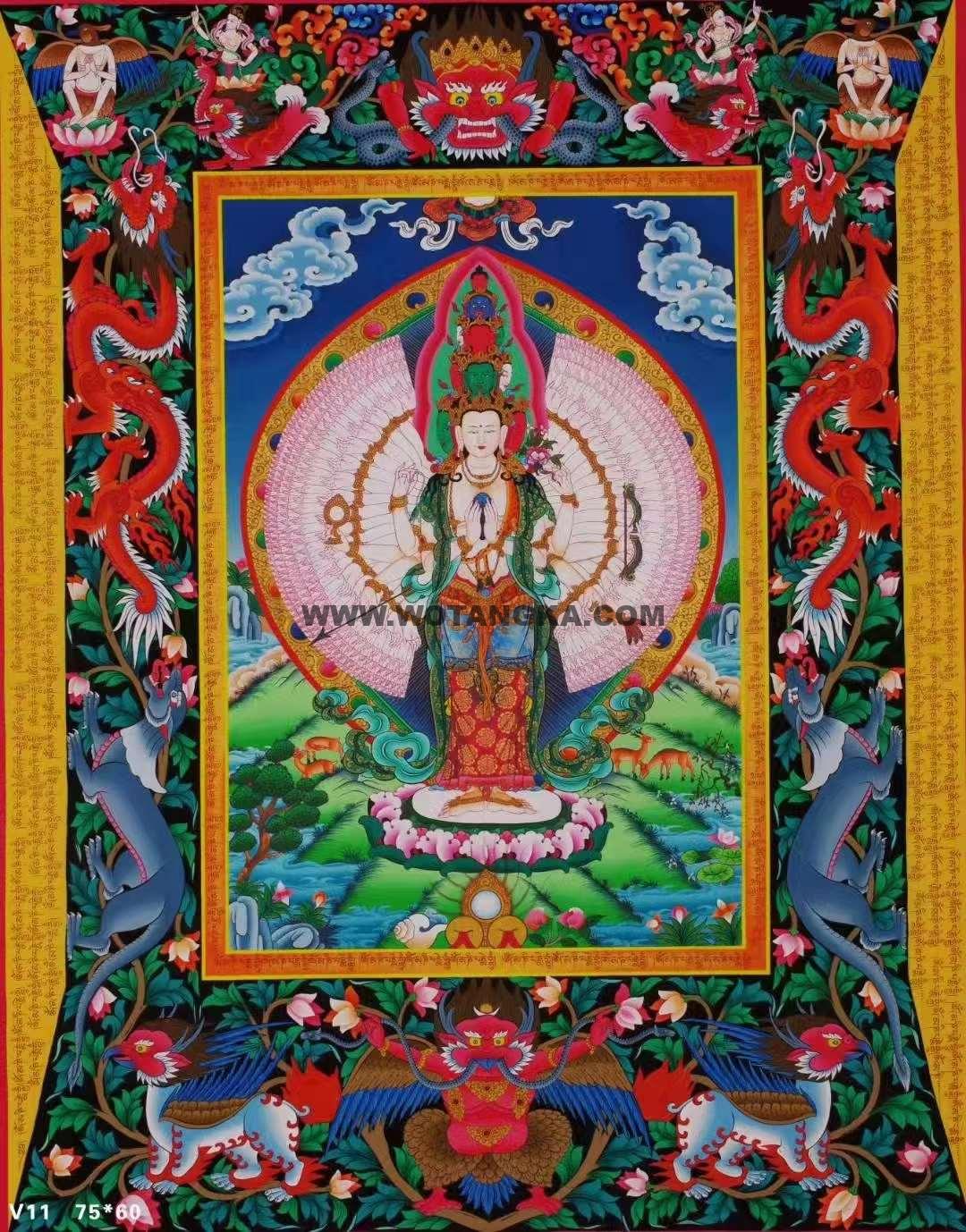尼泊尔成名喇嘛力作【千手观音】手绘布本唐卡,作品采用24K纯金金粉混合矿物颜料纯手绘而成。作品主尊宝相传神。布图精美、画工非常的细腻,严格的遵照佛经的度量仪轨如法绘制,期待有缘人。
