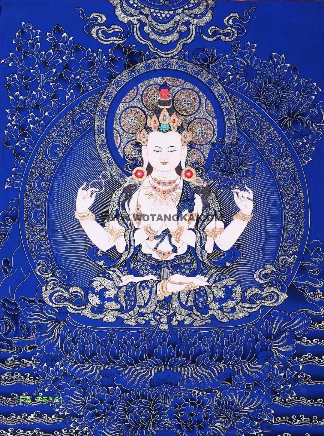 热贡成名画师力作《四臂观音》唐卡手绘布本。作品采用24K真金描线,蓝底色打底,天然矿石颜料着色晕染,画工细腻,开脸殊胜,是一副难得一见的好唐卡作品。