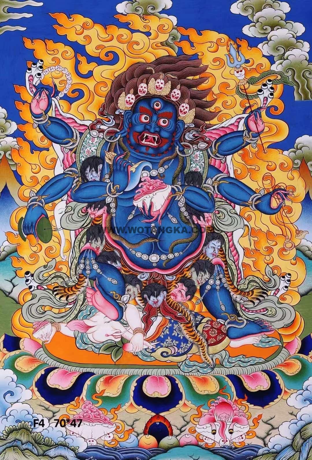 大黑天又称“玛哈噶拉”,是梵语的音译,藏名为“滚波恰珠巴”,据言为大日如来降魔时所化现的,其形象有二臂、四臂、六臂数种。大黑天是西藏最为人所熟知的保护神之一。据说大黑天曾被观音驯服过,有时又被看作是菩萨的忿怨身。大黑天通常作为战神的形象出现。