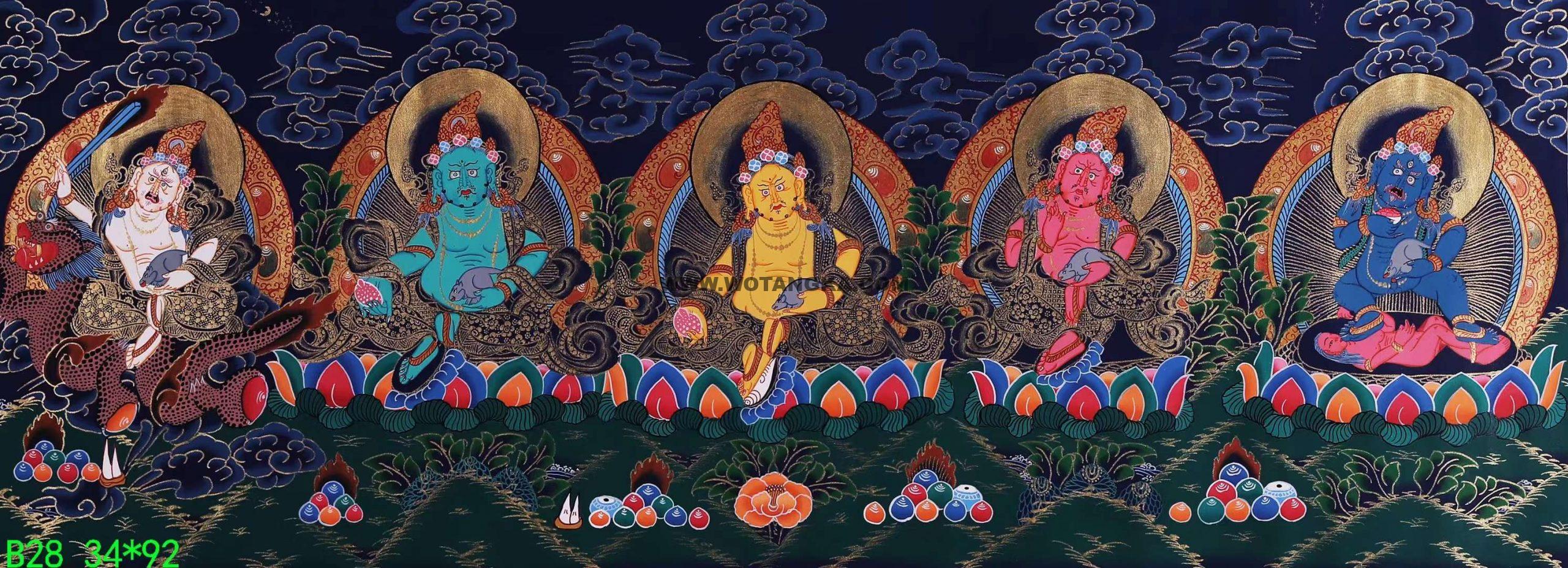 尼泊尔成名画师手绘力作,纯手绘布本唐卡【五方财神】,作品采用24K真金金粉混合天然颜料纯手绘而成。作品主尊宝相传神。布图干净精美、画工非常的细腻,严格的遵照佛经的度量仪轨如法绘制,期待有缘人。
