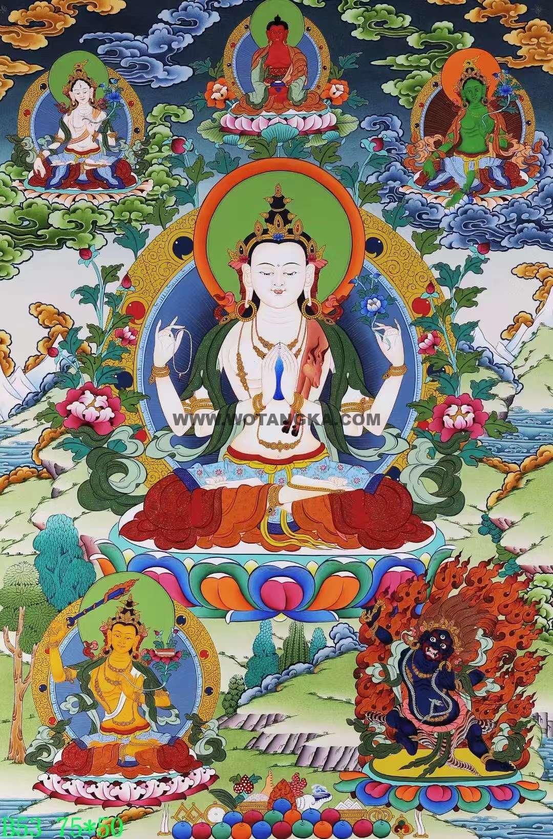 尼泊尔成名画师手绘力作,纯手绘布本唐卡【四臂观音·三怙主】,作品采用24K真金金粉混合天然颜料纯手绘而成。作品主尊宝相传神。布图干净精美、画工非常的细腻,严格的遵照佛经的度量仪轨如法绘制,期待有缘人。