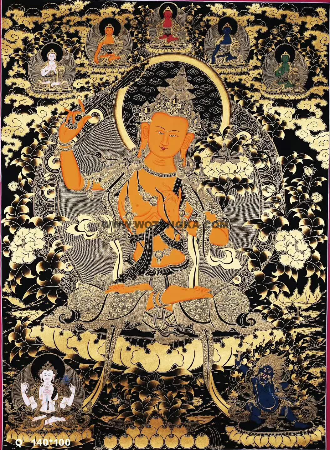尼泊尔知名唐卡大师作品《文殊菩萨》,作品采用24K真金磨粉描线,混合天然颜料纯手绘而成。作品主尊宝相传神,布图干净精美、画工非常的细腻,严格的遵照佛经的度量仪轨如法绘制,期待有缘人。