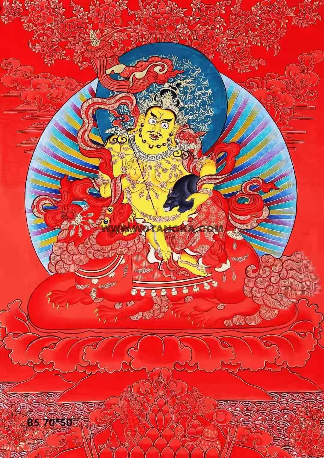 中国唐卡艺术作品中艳丽的红唐【财宝天王】唐卡手绘布本,热贡知名画师力作,收藏供奉不要错过。作品主尊宝相传神, 采用天然矿石晕染,纯金描线,画工细腻,殊胜,精美、风格富丽,采用24K真金描绘,画工细腻,开脸殊胜,是一副难得一见的好唐卡作品。