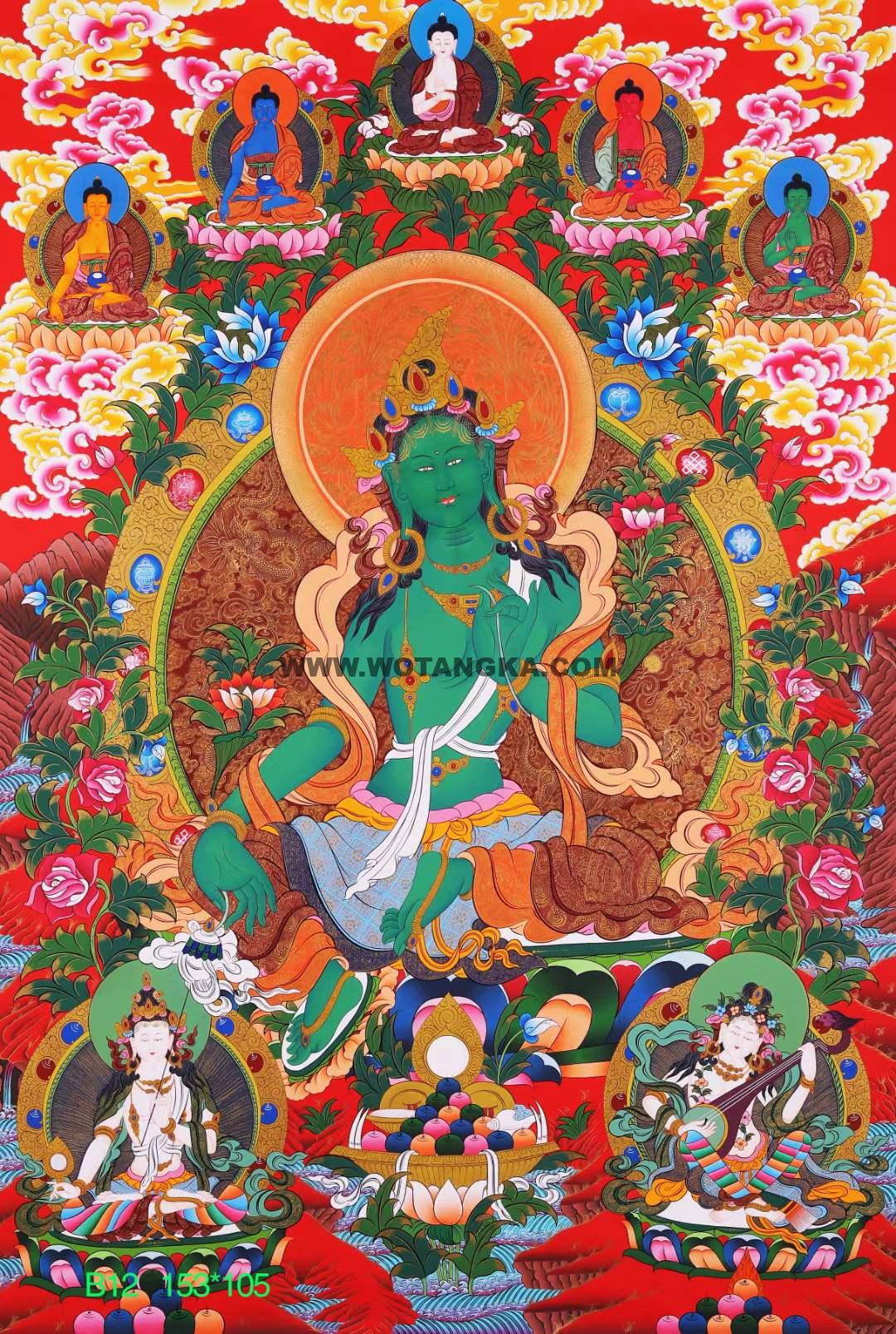 尼泊尔知名唐卡大师手绘力作唐卡【绿度母】,主尊宝相传神,作品采用24K真金描线,天然矿石颜料着色晕染,画工细腻,开脸殊胜,是一副难得一见的好唐卡作品。