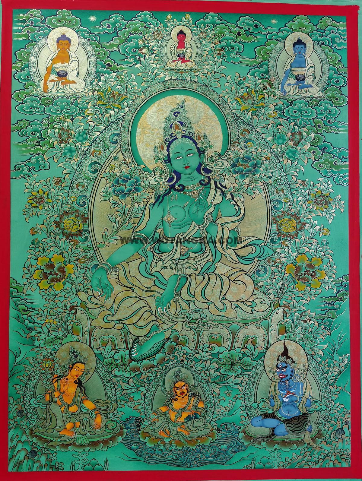 中国唐卡艺术作品中的【绿度母】唐卡手绘布本,热贡知名画师扎巴力作,收藏供奉不要错过。作品主尊宝相传神, 采用天然矿石晕染,纯金描线,画工细腻,殊胜,精美、风格富丽,采用24K真金描绘,画工细腻,开脸殊胜,是一副难得一见的好唐卡作品。