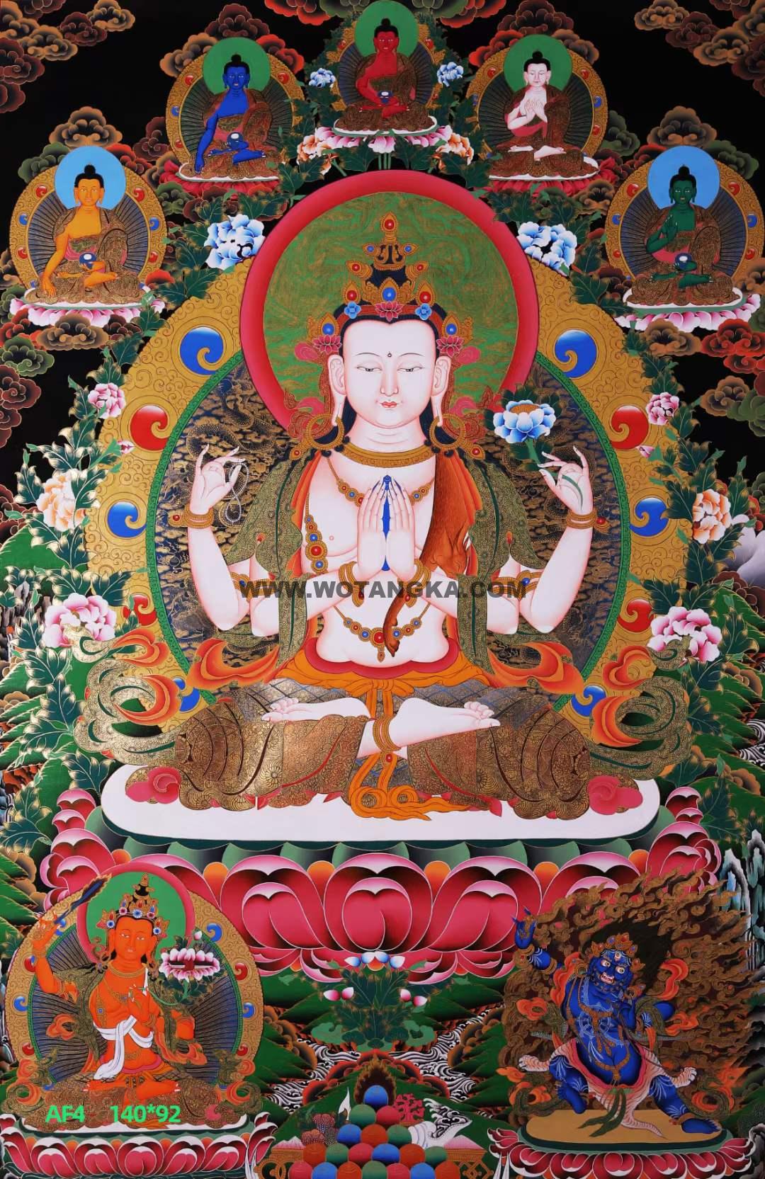 四臂观音是雪域西藏的守护神,藏人由老至幼家家户户,皆吟诵其六字大明咒:“嗡嘛呢叭咪吽”。四臂观音与文殊菩萨、金刚手菩萨,合称三族姓尊,代表大悲、大智、大力,为密乘行者人人必修的法门。