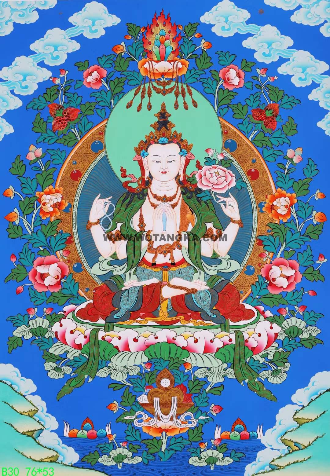 四臂观音是雪域西藏的守护神,藏人由老至幼家家户户,皆吟诵其六字大明咒:“嗡嘛呢叭咪吽”。四臂观音与文殊菩萨、金刚手菩萨,合称三族姓尊,代表大悲、大智、大力,为密乘行者人人必修的法门。