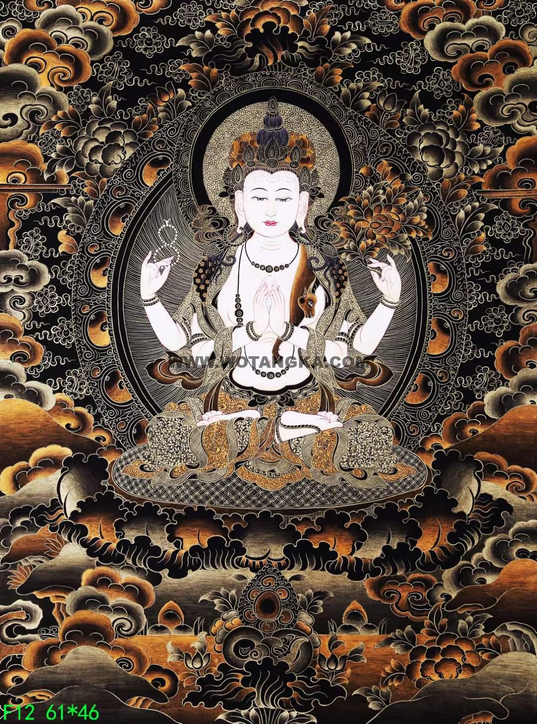 四臂观音是雪域西藏的守护神,藏人由老至幼家家户户,皆吟诵其六字大明咒:“嗡嘛呢叭咪吽”。四臂观音与文殊菩萨、金刚手菩萨,合称三族姓尊,代表大悲、大智、大力,为密乘行者人人必修的法门。