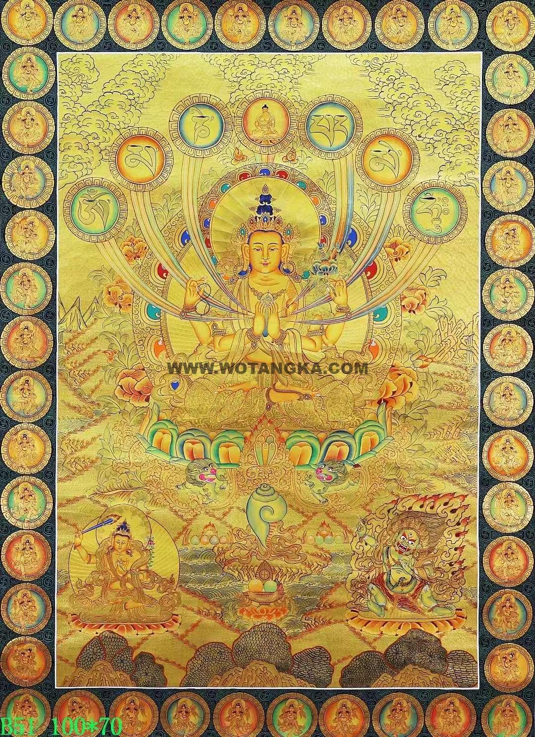 四臂观音是雪域西藏的守护神,藏人由老至幼家家户户,皆吟诵其六字大明咒:“嗡嘛呢叭咪吽”。四臂观音与文殊菩萨、金刚手菩萨,合称三族姓尊,代表大悲、大智、大力,为密乘行者人人必修的法门。