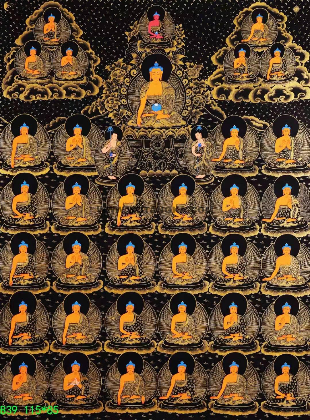 尼泊尔成名喇嘛手绘力作精品,纯手绘布本唐卡【释迦牟尼佛·三十五佛】,作品采用24K真金金粉混合天然颜料纯手绘而成。作品主尊宝相传神。布图干净精美、画工非常的细腻,严格的遵照佛经的度量仪轨如法绘制,期待有缘人。
