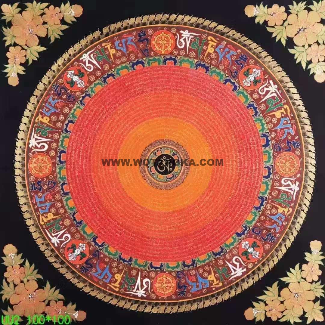 《六字真言坛城》唐卡是高端会所公司豪宅,背景墙,镇宅首选。坛城象征宇宙本源,是圣坛的代表,挂与家里玄关之处,有镇宅辟邪的妖邪不入的作用,古代著名寺院皇宫都用此法门来镇宅辟邪,十分殊胜。喜欢不要错过。六字大明咒是观世音菩萨心咒,源于梵文中,此咒含有诸佛无尽的加持与慈悲,是诸佛慈悲和智慧的音声显现。能改变命运,修成幸福健康的人生。