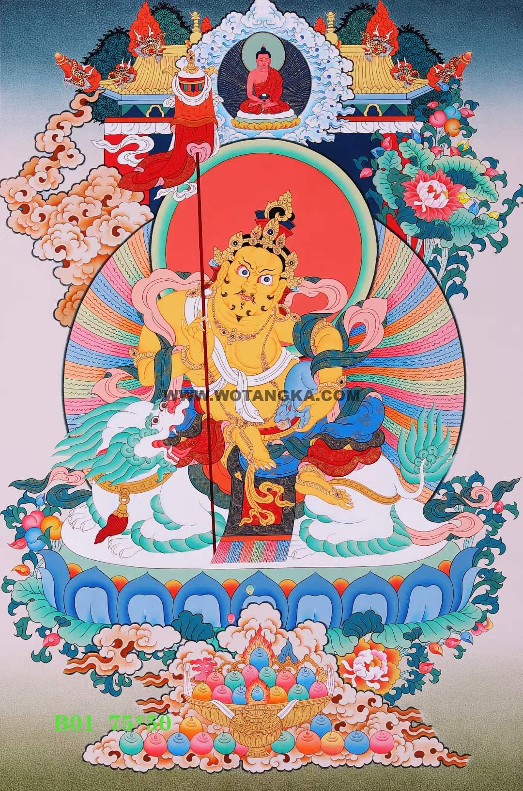 尼泊尔知名唐卡大师力作《财宝天王》 唐卡手绘布本,采用天然矿物、宝石、植物、24K真金描绘。天然矿石颜料着色晕染,画工细腻,开脸殊胜,是一副难得一见的好唐卡作品。喜欢不要错过。