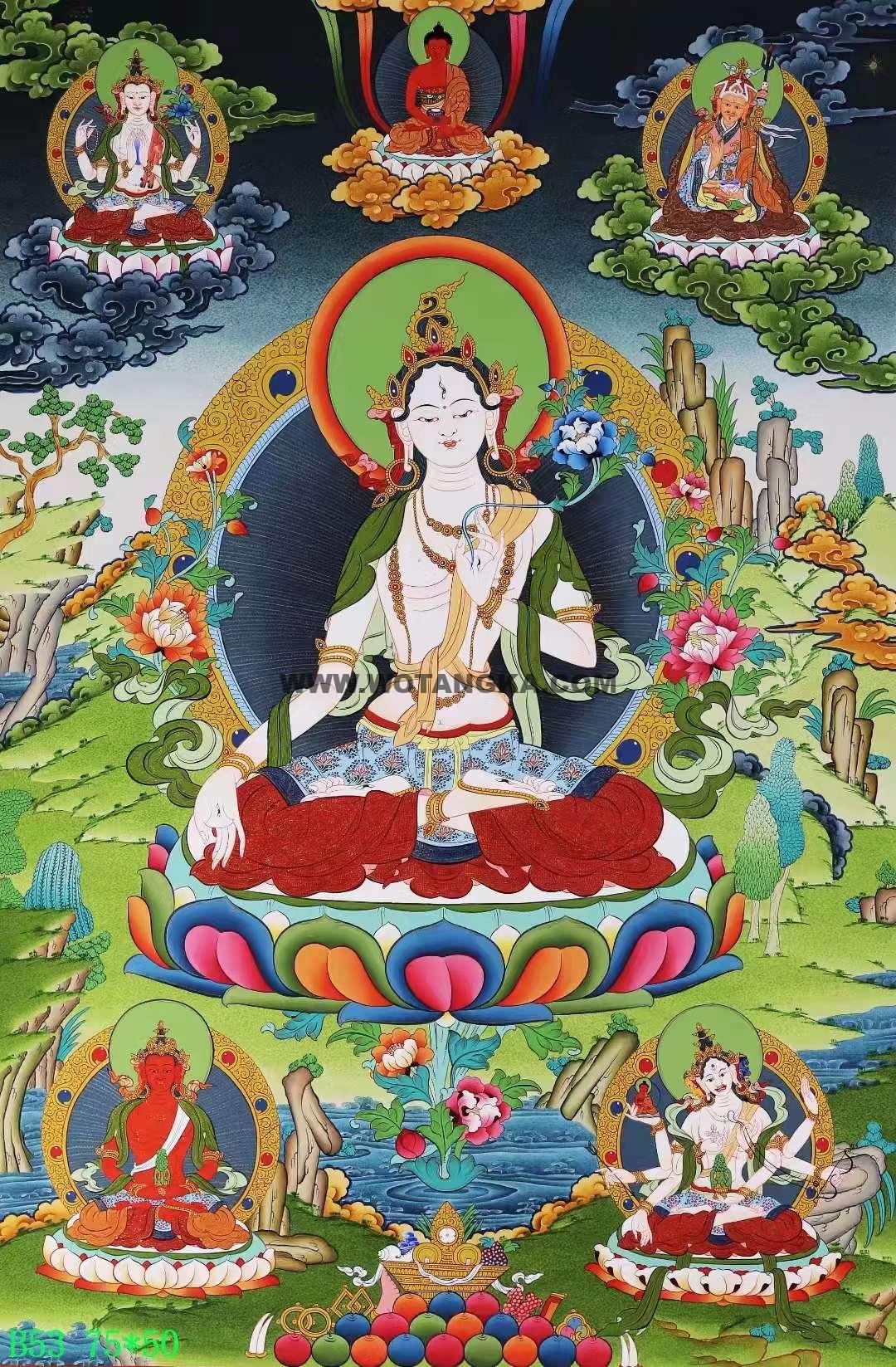 在藏传佛教中,长寿佛、尊胜佛母、白度母被认为是福寿吉祥的象征,称为“长寿三尊”。白度母为二十一度母之一,是一切众生尤其是女性的无比圣神,是保佑心想事成,赐寿除障的如意宝。白度母集二十一度母之功德于一身,能消除病痛邪风,妖魔鬼怪等外部之障与贪嗔痴等内部之障,勇猛无比,形随众生,变幻莫测。藏传佛教认为生信者只要一念及,即能以兄弟姐妹之情倾力相助,堪称众女神之王。白度母是能够为一切众生赐予长寿的一尊度母,许多信仰众所知道的白度母是一位赐予众生长寿的本尊,其实不止这些,如果虔诚地修持她的法门,也可以使智慧迅速增长。转化身边不善磁场,驱邪治病,积累福德,平安吉祥!一切圆满!
