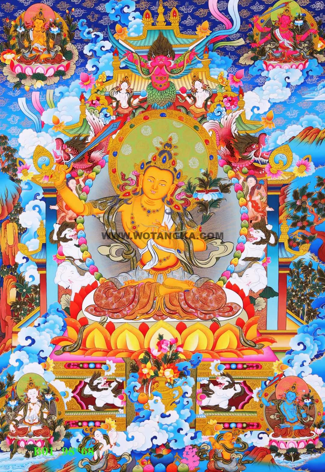 主尊为黄文殊,身黄色,头戴五佛冠,表示五方佛的五种智能,头顶做成五个发髻,表示内心已经证得五智,右手高举般若焰剑,表断一切无明、愚昧、昏黯。左手当胸作转法轮印,并拈青莲花梗,沿手臂而上。花开齐于耳际,莲瓣上平放着般若波罗蜜多梵匣,表般若智能浩瀚如经典。一切珠宝璎珞表其报身圆满,以金刚双跏趺姿势安住于莲花日轮上。