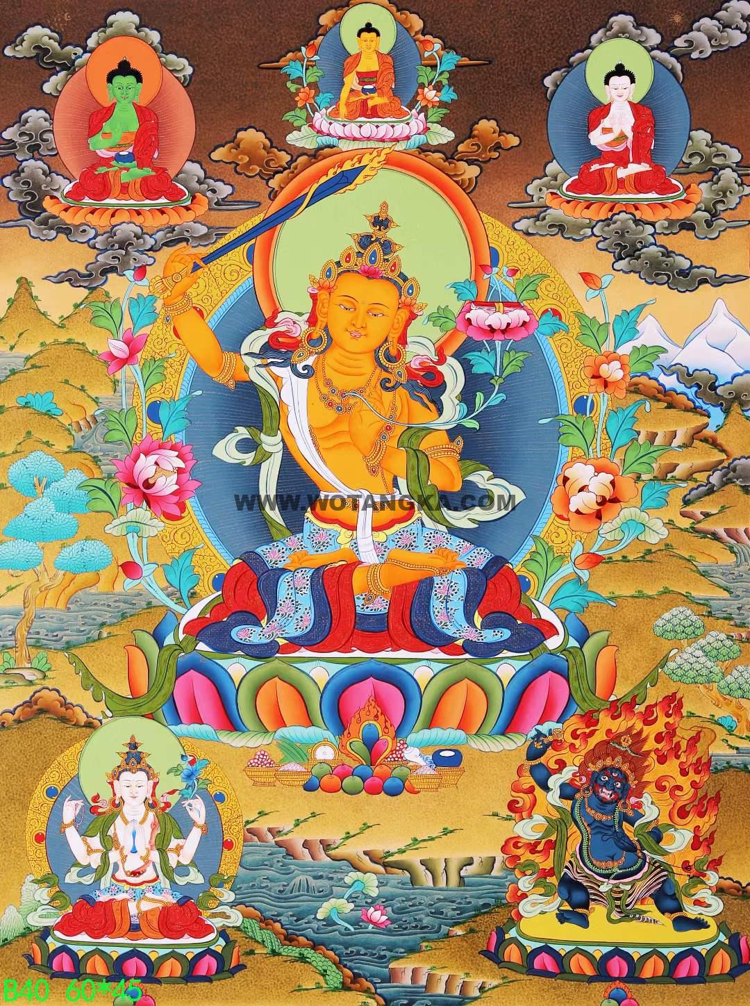 主尊为黄文殊,身黄色,头戴五佛冠,表示五方佛的五种智能,头顶做成五个发髻,表示内心已经证得五智,右手高举般若焰剑,表断一切无明、愚昧、昏黯。左手当胸作转法轮印,并拈青莲花梗,沿手臂而上。花开齐于耳际,莲瓣上平放着般若波罗蜜多梵匣,表般若智能浩瀚如经典。一切珠宝璎珞表其报身圆满,以金刚双跏趺姿势安住于莲花日轮上。