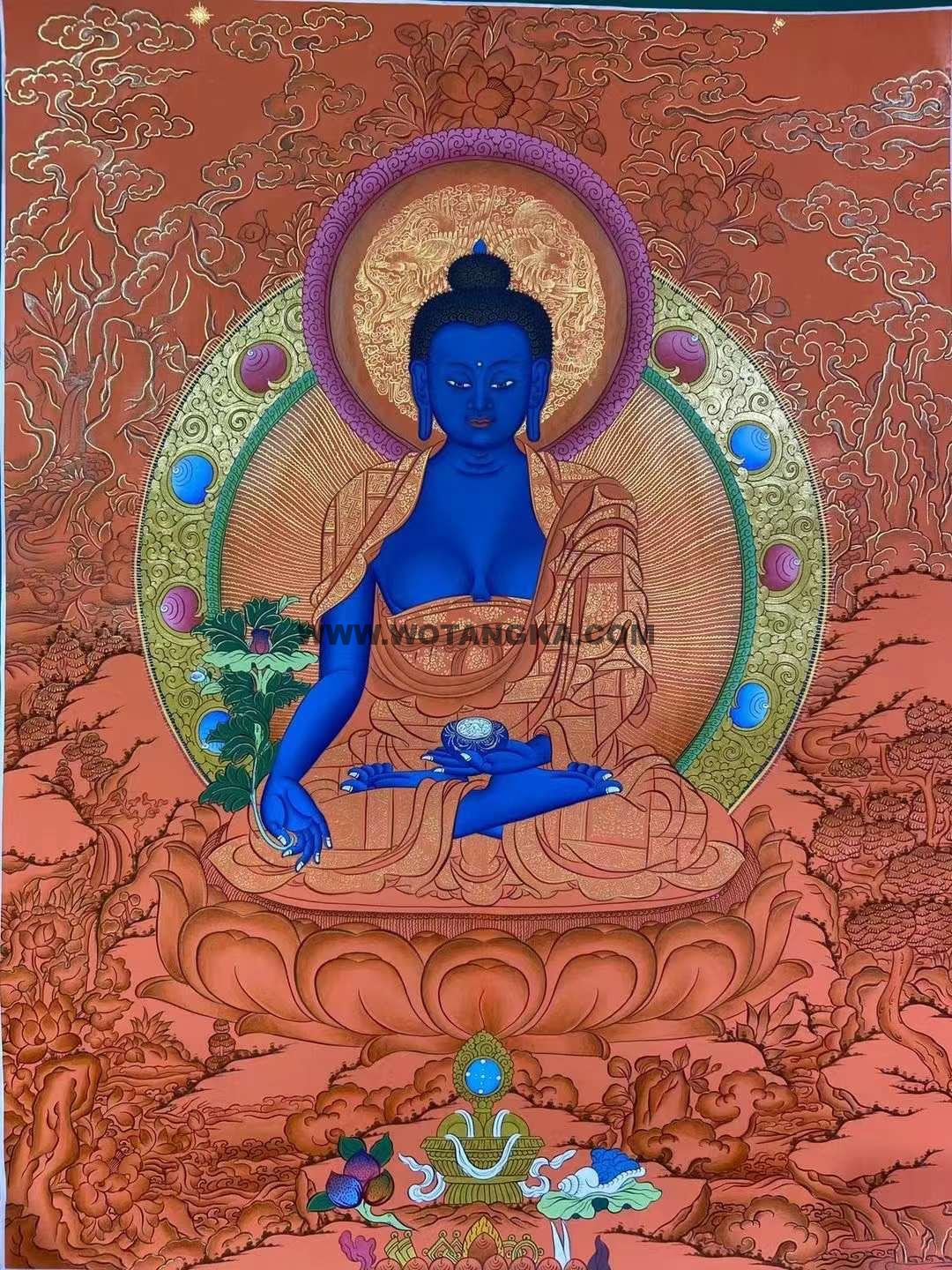 尼泊尔成名唐卡画师手绘力作精品红唐【 药师佛】唐卡手绘布本,采用天然矿物、植物、宝石、真金磨粉、纯手工加持绘制,开脸细腻殊胜、为难得之佳作、寻有福人。