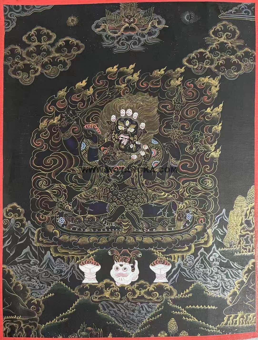 玛哈嘎拉是梵语,意思是“大黑”,即“怙主”之意。玛哈嘎拉是佛教三根本的化身。其为调伏刚强众生而呈现忿怒相,本尊及眷属护法众除护持佛法外,依缘起多示现为两臂、四臂、六臂黑,白等形象,为藏传佛教诸宗共同推崇的智慧护法。