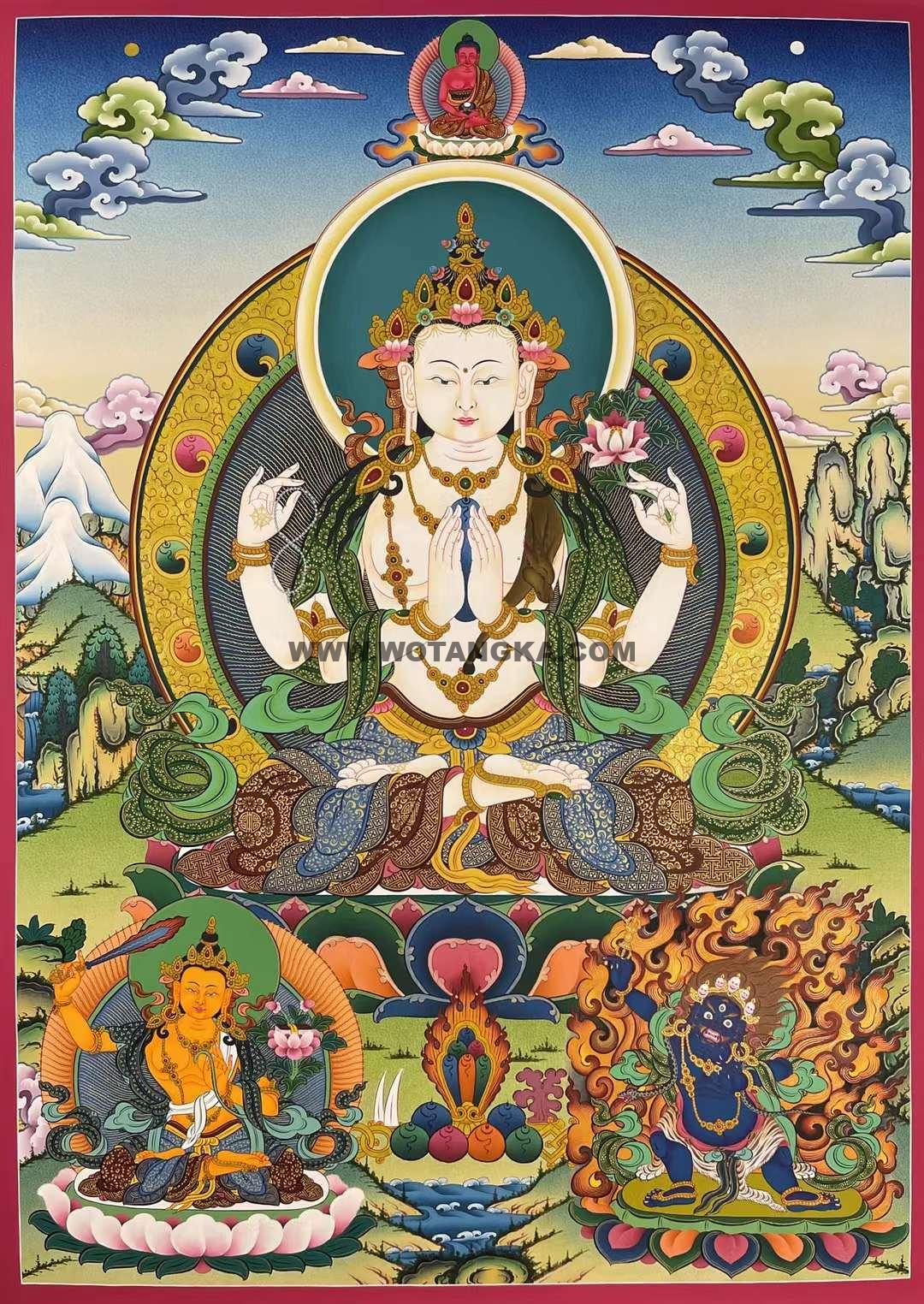 四臂观音是雪域西藏的守护神,藏人由老至幼家家户户,皆吟诵其六字大明咒:“嗡嘛呢叭咪吽”。四臂观音与文殊菩萨、金刚手菩萨,合称三族姓尊,代表大悲、大智、大力,为密乘行者人人必修的法门。