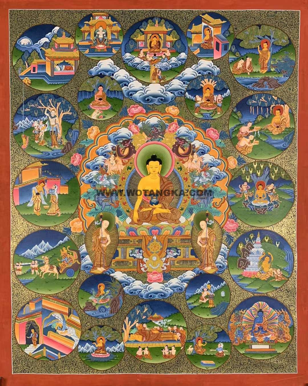 尼泊尔知名唐卡大师力作《释迦牟尼佛·佛本身故事图》 唐卡手绘布本,采用天然矿物、宝石、植物、24K真金描绘。天然矿石颜料着色晕染,画工细腻,开脸殊胜,是一副难得一见的好唐卡作品。喜欢不要错过。