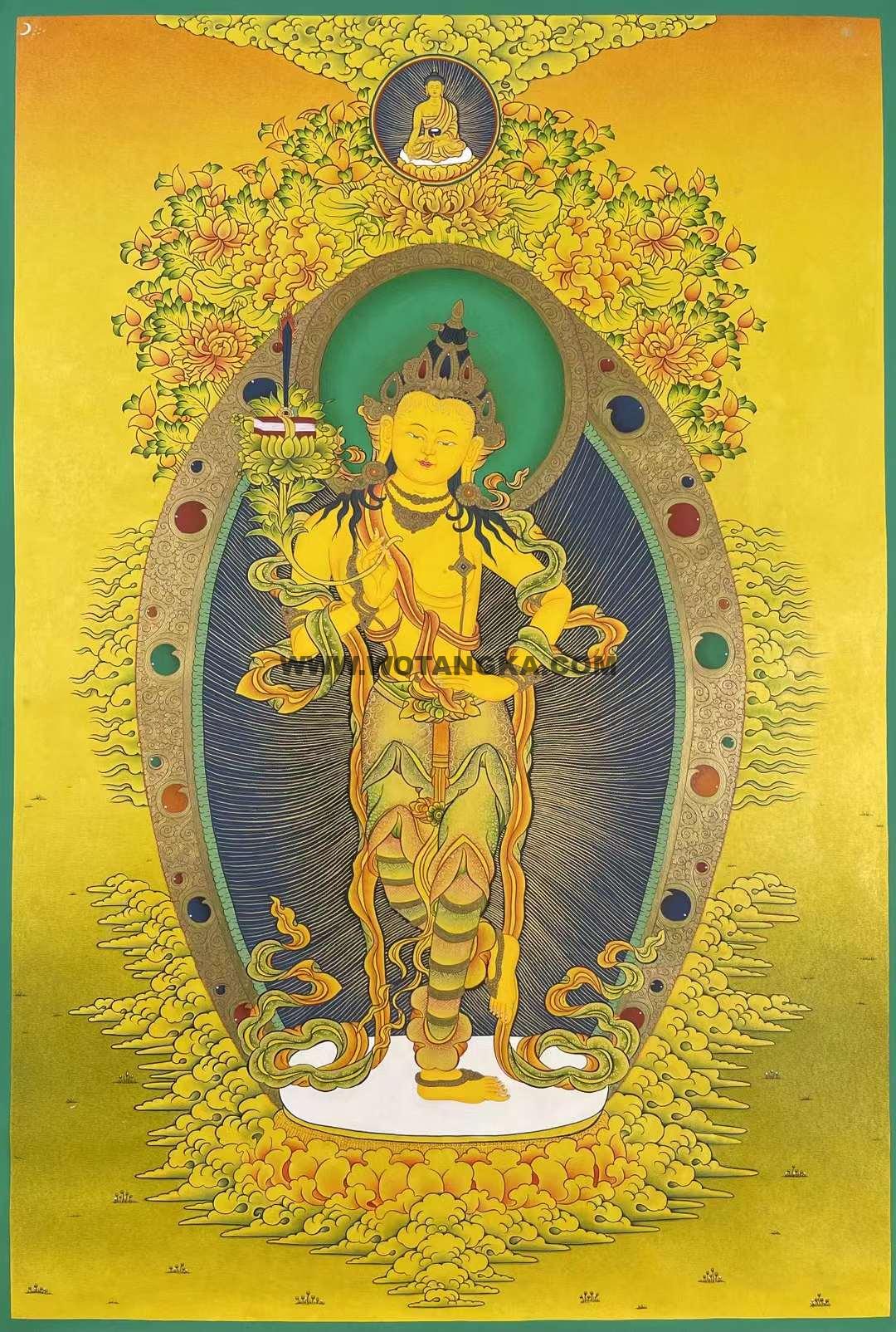 尼泊尔成名喇嘛手绘力作精品,纯手绘布本唐卡【文殊菩萨】,作品采用24K真金金粉混合天然颜料纯手绘而成。主尊宝相传神、开脸细腻殊胜、画工精美、用天然矿物、植物、宝石、真金磨粉、纯手工加持绘制、收藏供奉之首选、期待有缘人。