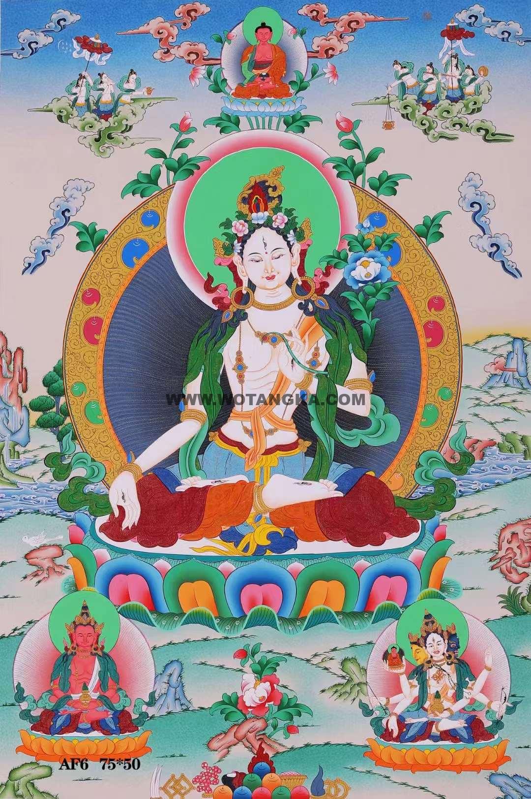 白度母(White Tara),又称为增寿救度佛母,是观世音菩萨的化身。观世音有32种应化身,仅其中的度母化身就可以变化为21位救度母,白度母即为圣救度佛母的二十一尊化身之一。在藏传密教中,绿度母与白度母是二十一尊度母之中流传最广的。而藏密又常以长寿佛、白度母及尊胜佛母等三尊合称为:“长寿三尊”。白度母具有救度八难的威德。白度母是能够为一切众生赐予长寿的一尊度母,许多信仰众所知道的白度母是一位赐予众生长寿的本尊,其实不止这些,如果虔诚地修持她的法门,也可以使智慧迅速增长。