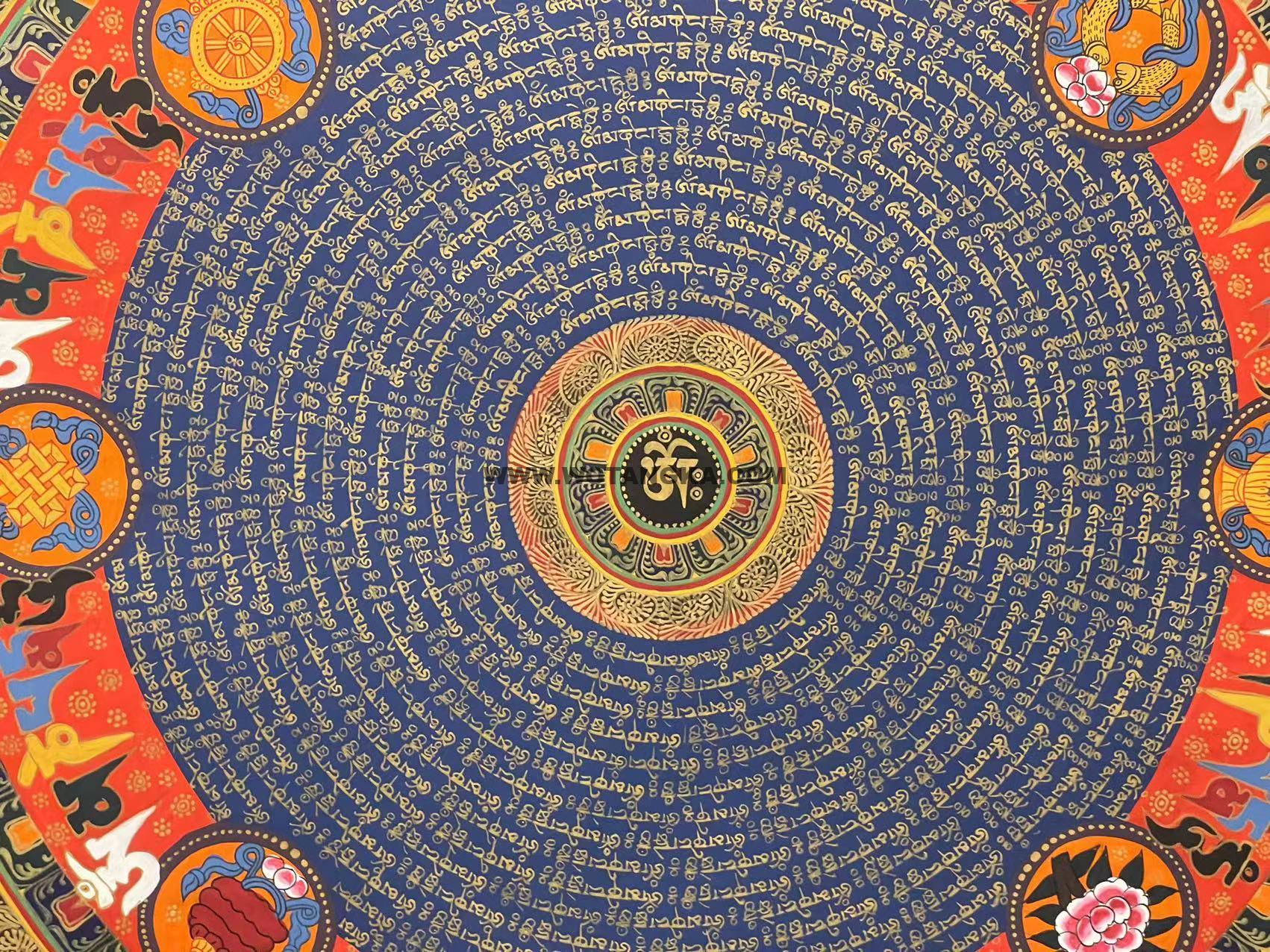 尼泊尔知名唐卡大师作品《吉祥八宝坛城》,作品采用黑底色打底,24K真金磨粉描线,混合天然颜料纯手绘而成。作品主尊宝相传神,布图干净精美、画工非常的细腻,严格的遵照佛经的度量仪轨如法绘制,期待有缘人。
