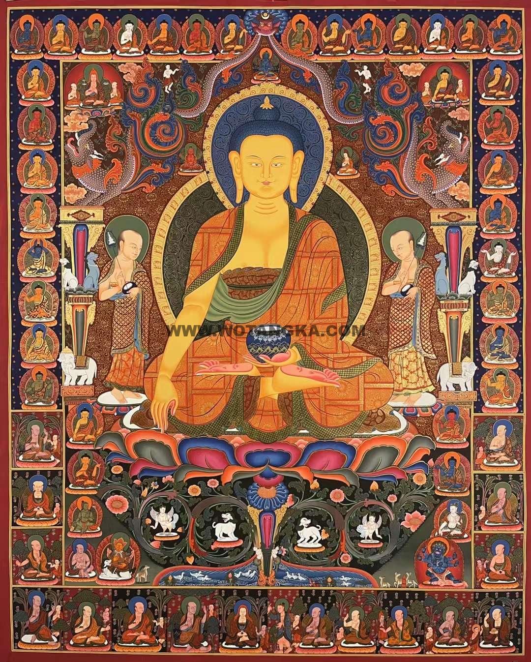 中央主尊为释迦牟尼佛,其两旁为其二弟子,四周整齐排列的为三十五佛与十八罗汉,整幅唐卡为古典尼藏风格,中央主尊释迦牟尼佛占比巨大,四周各尊占比小且整齐排布,佛陀衣饰为满纹描金,背光绘满卷草纹,画工精致。