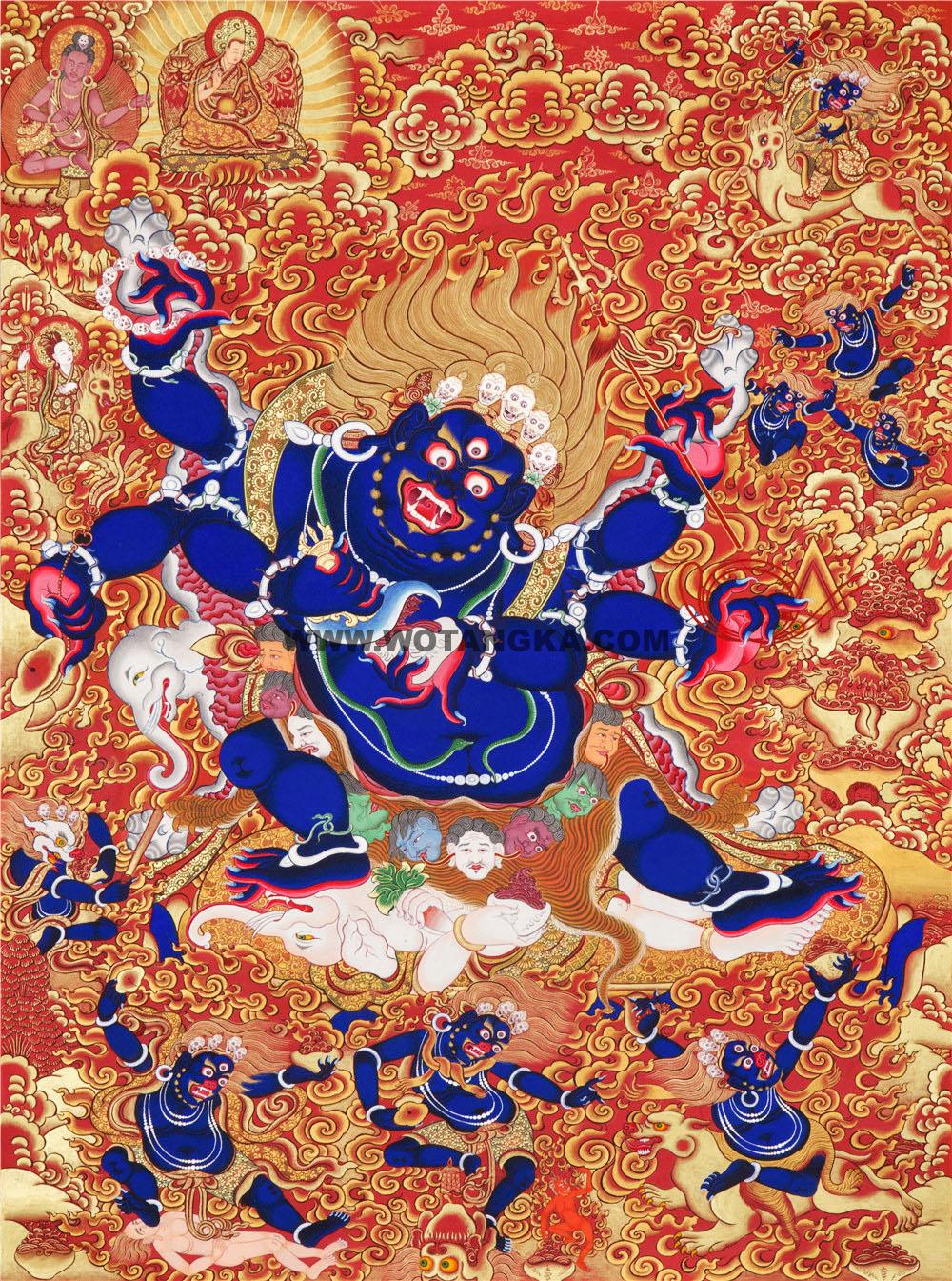 玛哈嘎拉是梵语,意思是“大黑”,即“怙主”之意。玛哈嘎拉是佛教三根本的化身。其为调伏刚强众生而呈现忿怒相,本尊及眷属护法众除护持佛法外,依缘起多示现为两臂、四臂、六臂黑,白等形象,为藏传佛教诸宗共同推崇的智慧护法。